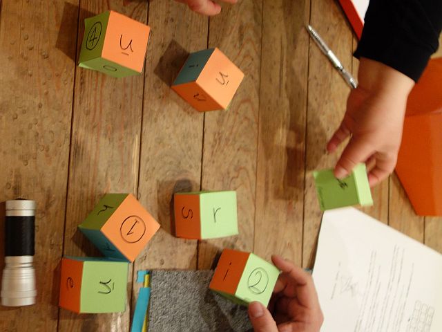 文字の書かれていないキューブを見本に、