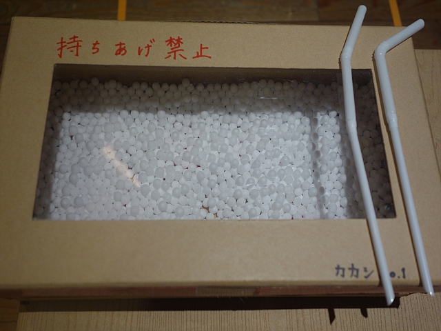 ビーズが入った箱には「持ち上げ禁止」と書かれています。