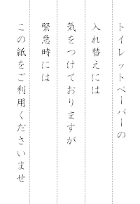 トイレライトの側面、扉の左上、トイレットペーパーホルダーに 1/3「ふん」、2/3「ころ」、3/3「がし」が貼ってありました。