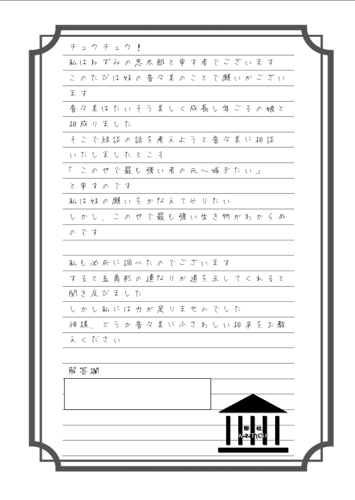 正しいルートを見つけ、ひたすら12面体を転がしてサルが上面にくる位置を読むと「ごおるのいきもの」となります。(ヒントを取得すると正しいルートを教えてもらえます)