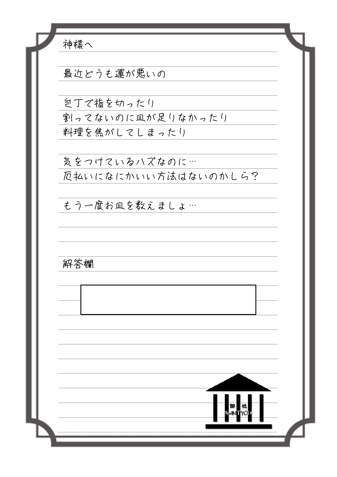 台所の戸棚の中に9枚の穴が空いた紙皿が隠されていました。 紙皿には1~8までの数字が書かれており、 同じ数字を皿を数えるように重ねていくと穴を通して文字が読めるようになります。