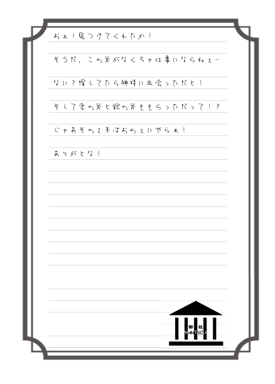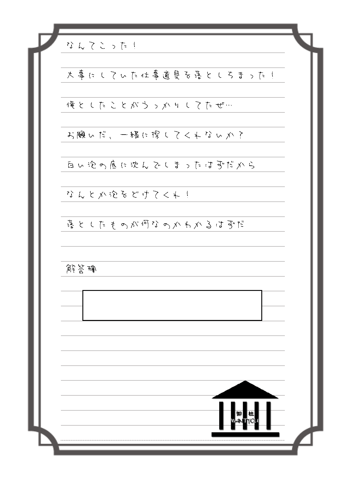 すると底には「あなたが落としたのは」「金の斧ですか?」「銀の斧ですか?」「あなたは正直者ですね」「落としたのはxxxxx」と書かれており、 イソップ寓話の『金の斧』の話から「ふつうのおの(てつのおの)」が答えです。