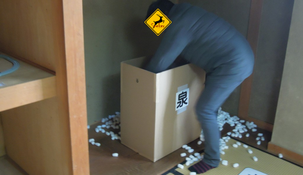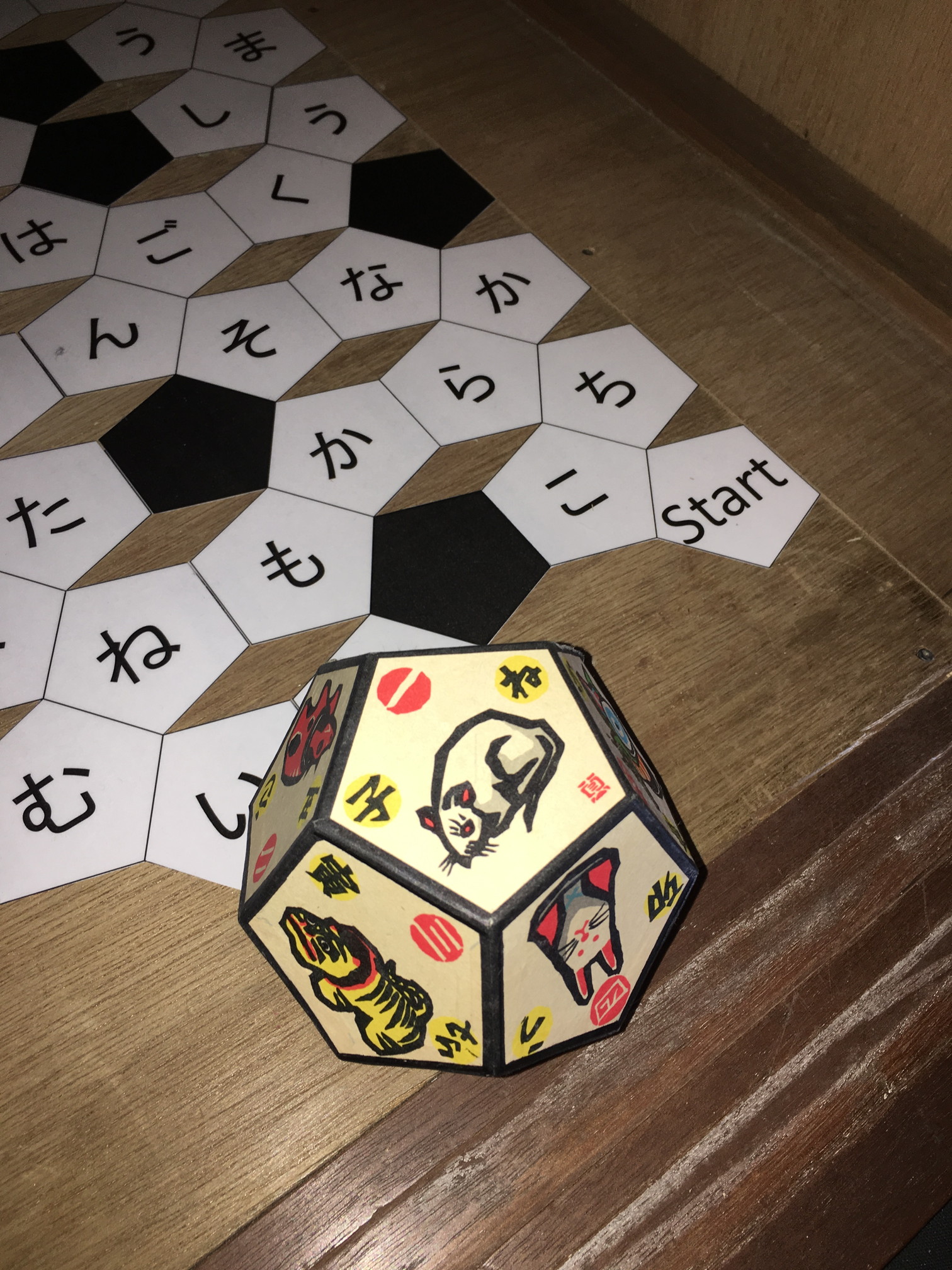 押し入れの下に正五角形が大量に連続したマスと干支が描かれた12面体が置かれています。