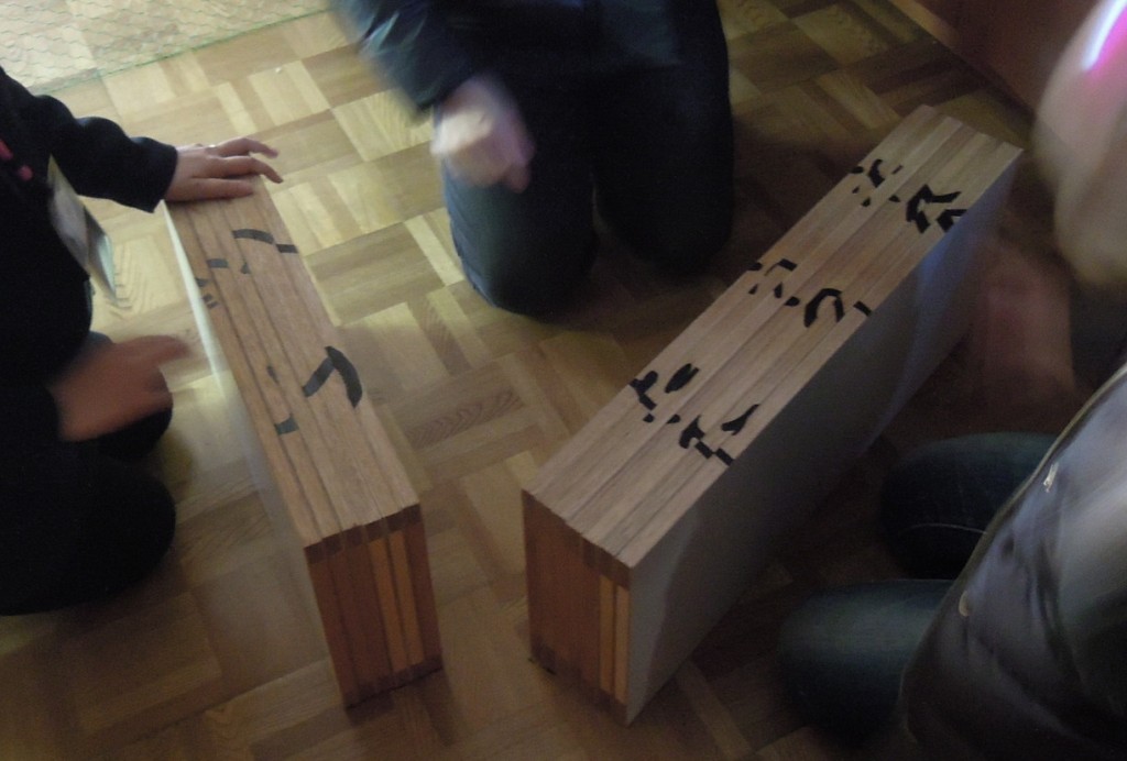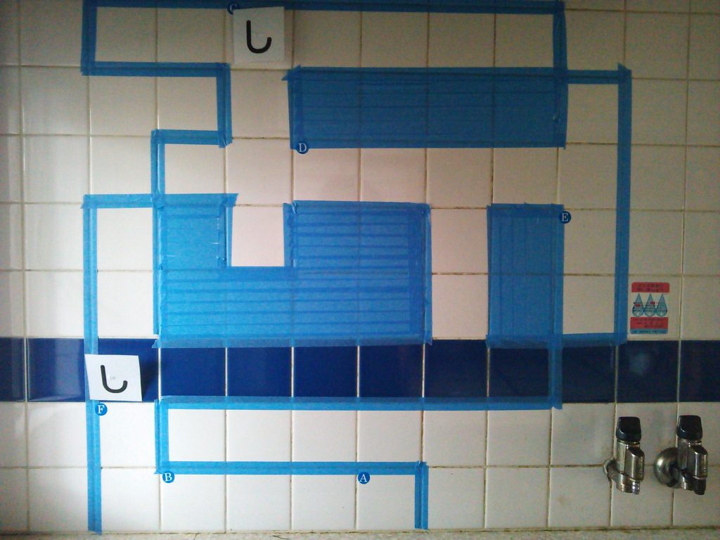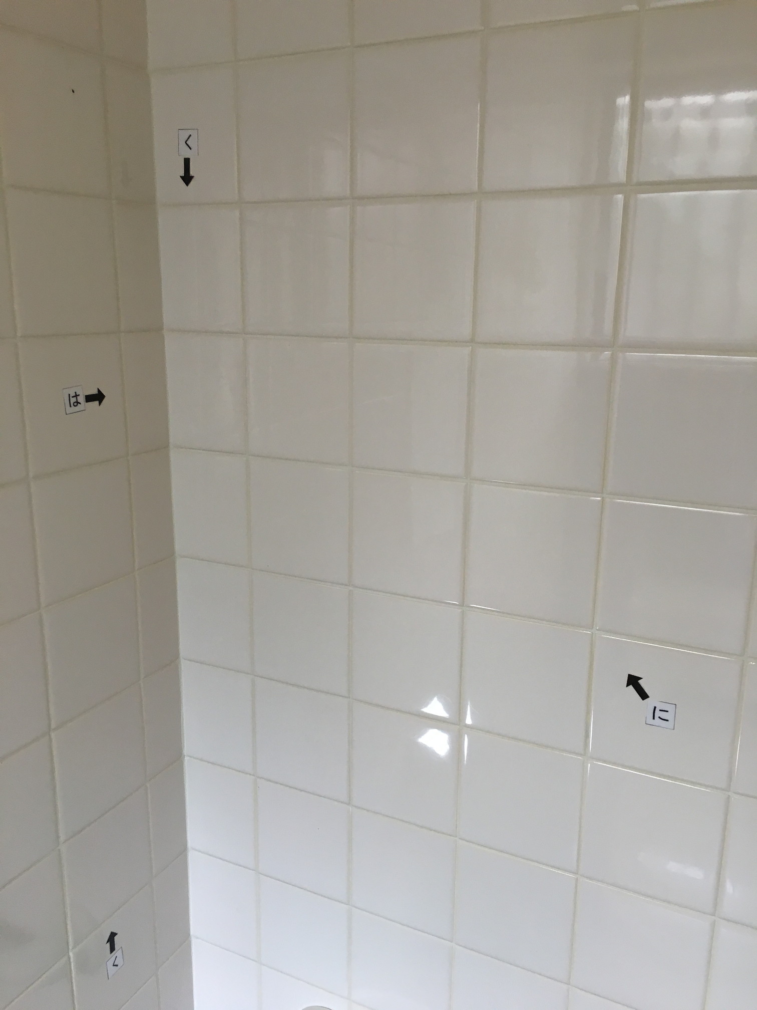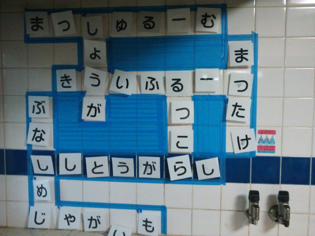 台所の引き出しの中には吸盤の付いたひらがなが隠されていました。 そして壁のタイルには枠が書かれています。