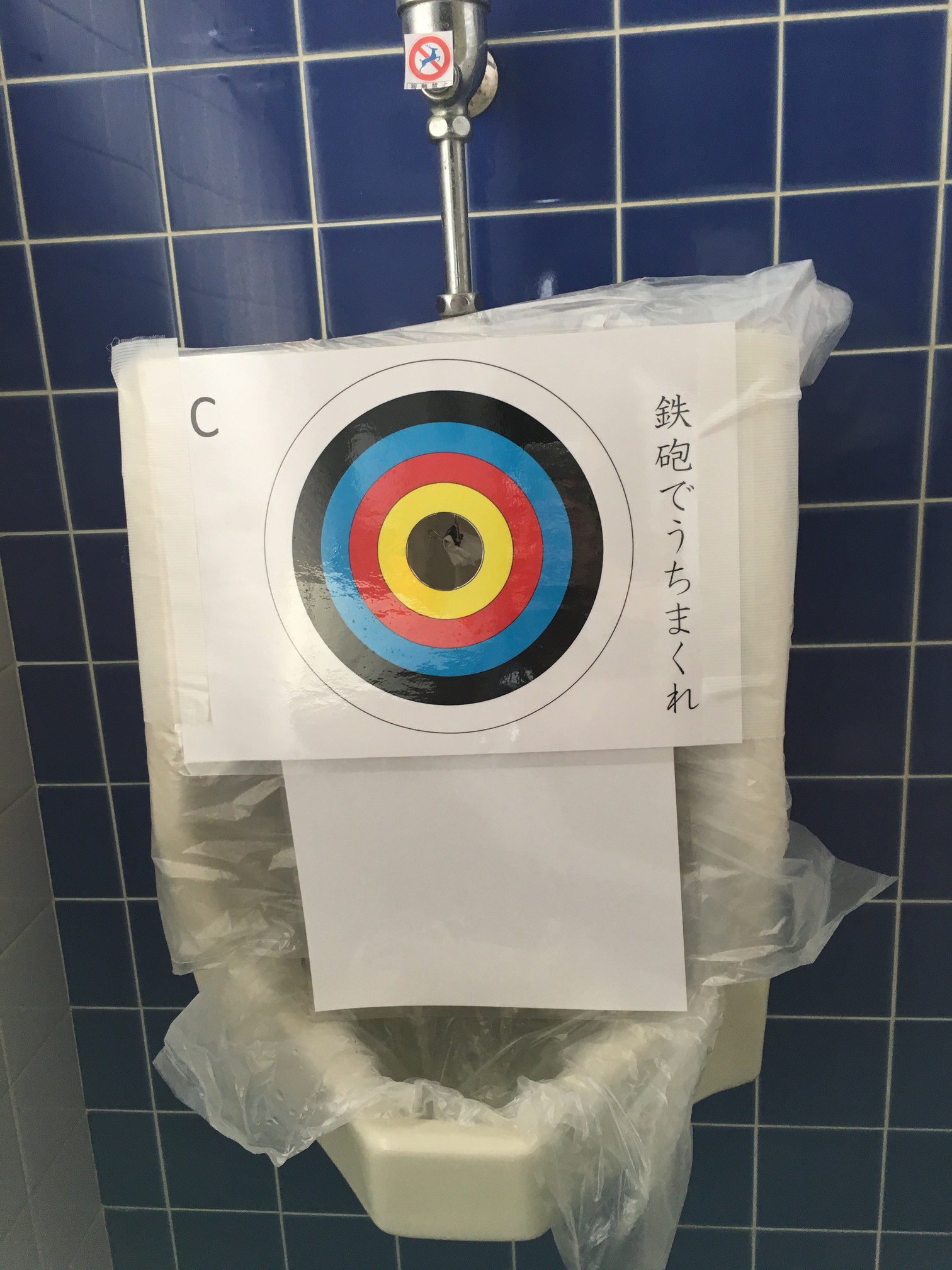 その的の真ん中に穴が開いていて、そばにある水鉄砲を撃ちまくるとトイレットペーパーでぶら下がっていたおもりが落ちてきます。