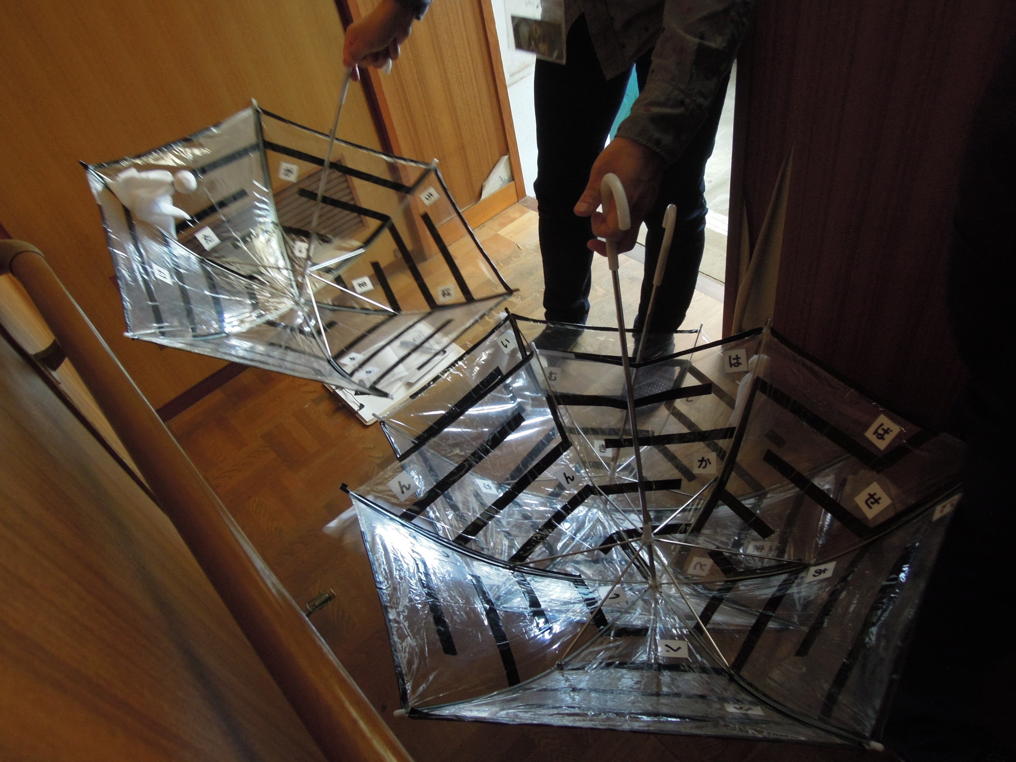 この手紙の近くには傘が3本と天井からてるてる坊主が吊られていました。