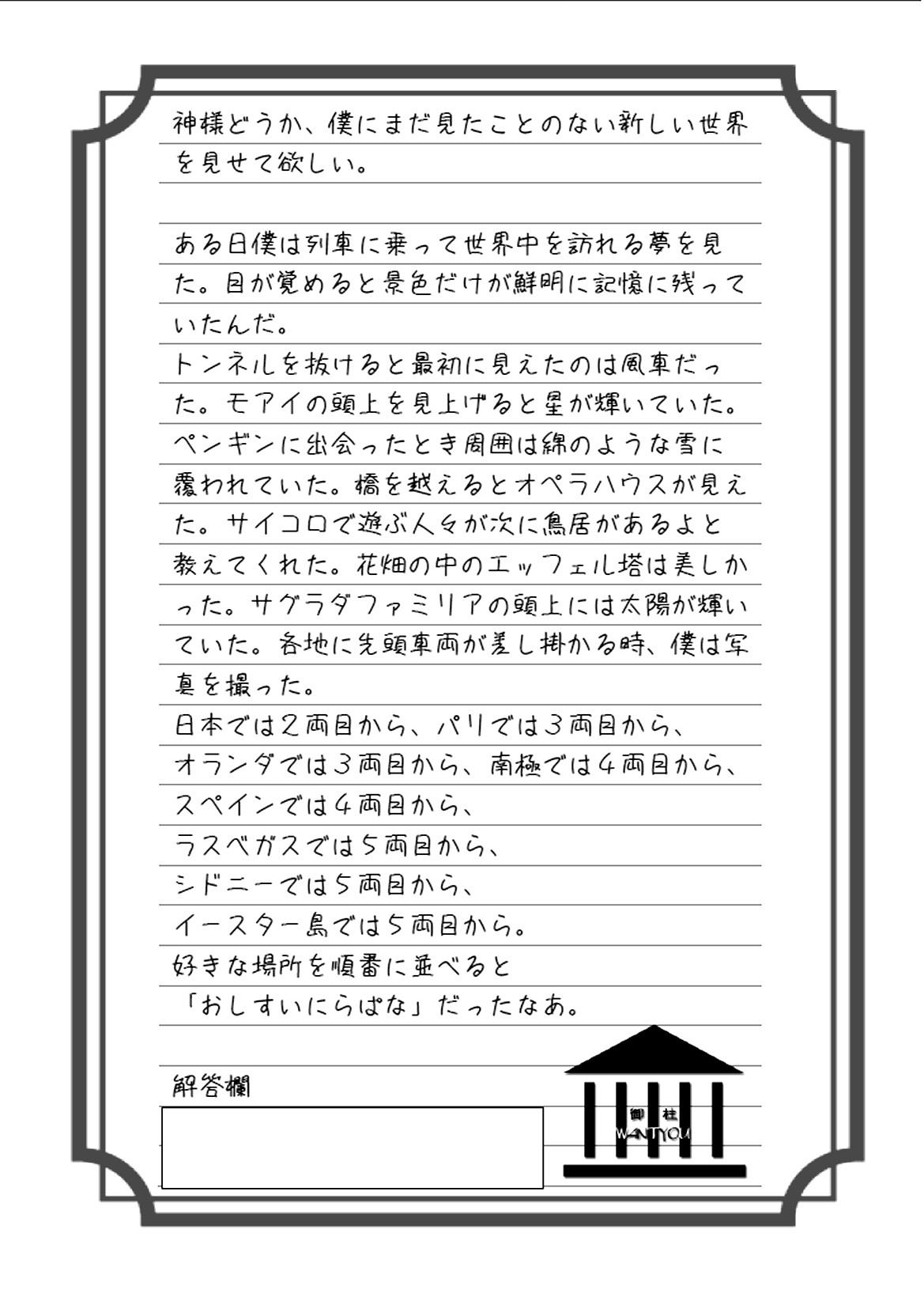 各地に電車の先頭車両が差し掛かるとき、手紙に書いてあるとおりの車両の場所に置かれている旗の文字を読みとります。ただし、手紙には置物の名前ではなく、地域の名前となっていました。