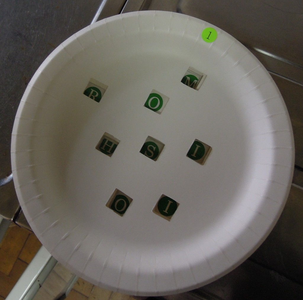 台所の戸棚の中に9枚の穴が空いた紙皿が隠されていました。 紙皿には1~8までの数字が書かれており、 同じ数字を皿を数えるように重ねていくと穴を通して文字が読めるようになります。